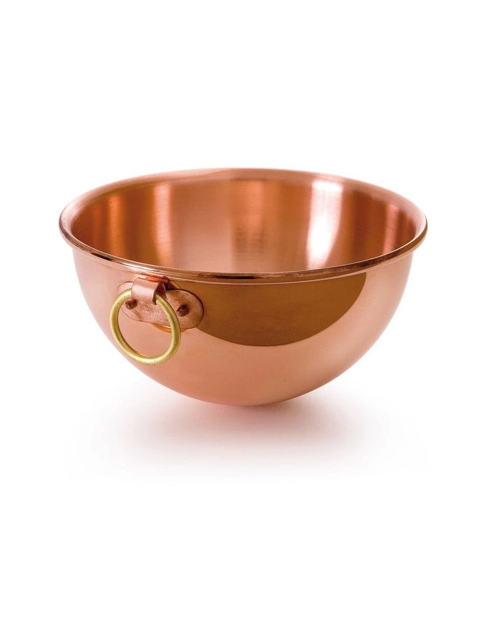 À quoi ça sert ? Le bassin à blancs d’œufs sert au montage des blancs en neige très ferme et sans cristallisation du sucre. Il est parfois doté d’un anneau ce qui facilite la prise en main et peut être à fond plat ou demi-sphérique. En quoi c’est fait ? Les bassins sont généralement en cuivre, un matériau toujours à l’aise avec le sucre. Les bassins se déclinent en plusieurs diamètres. Bassin destiné à battre les blancs d’œufs en neige. Bassin en cuivre avec un anneau pour le tenir.