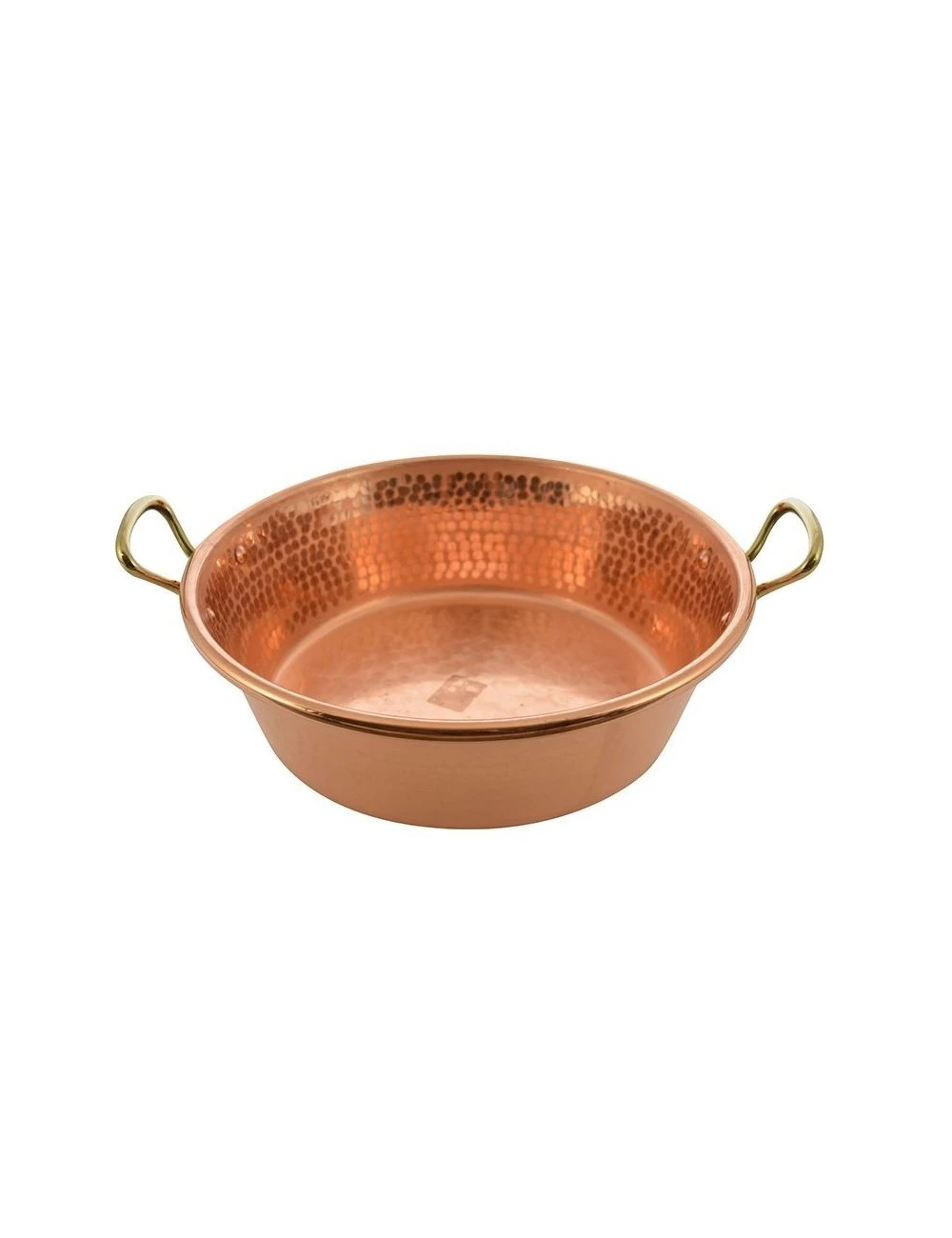 À quoi ça sert ? Certains modèles de bassines, très évasés, sont plus spécifiquement destinés à la fabrication des confitures. Bassine à confiture en cuivre, monture bronze. Le cuivre rouge est idéal pour le travail du sucre.