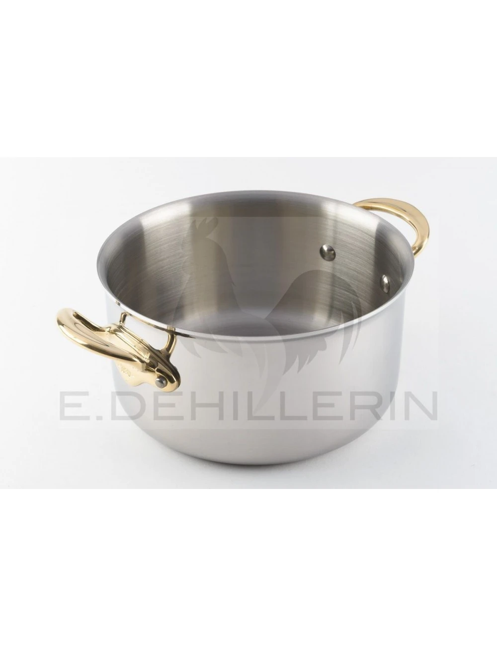 Bassine à ragout en acier inoxydable, monture bronze, avec couvercle. Un plat techniquement évolué avec une bonne conductivité. Sa monture bronze lui confère un certain cachet. Compatible tous feux dont induction.