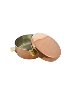 Braisière cuivre étamé, monture bronze, couvercle cuivre. Le cuivre et l’étain forment un couple très homogène et permettent une parfaite conduction de la chaleur. Attention toutefois : l’étain peut se détériorer à sec dès 230 °C. L’ustensile idéal pour cuire longuement au four une viande dans son jus. Le couvercle limite l’évaporation afin que la viande ne se dessèche pas.