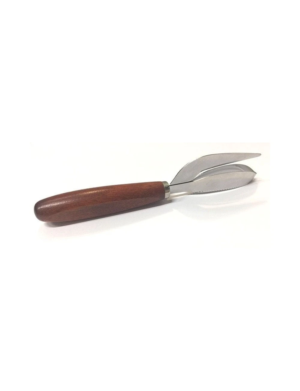 Ecailleur remplissant deux fonctions. Sa lame en inox permet à la fois d’écailler le poisson et de l’ouvrir afin de le vider. Le manche est en bois.