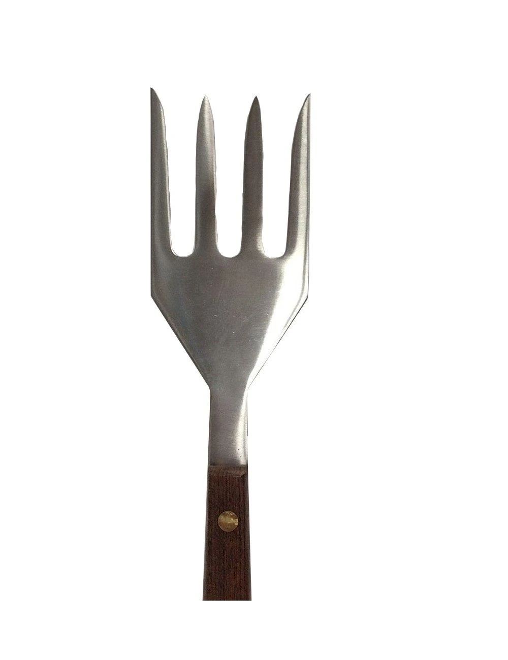 Fourchette large à quatre dents en acier inox, manche en palissandre, bois hautement robuste.