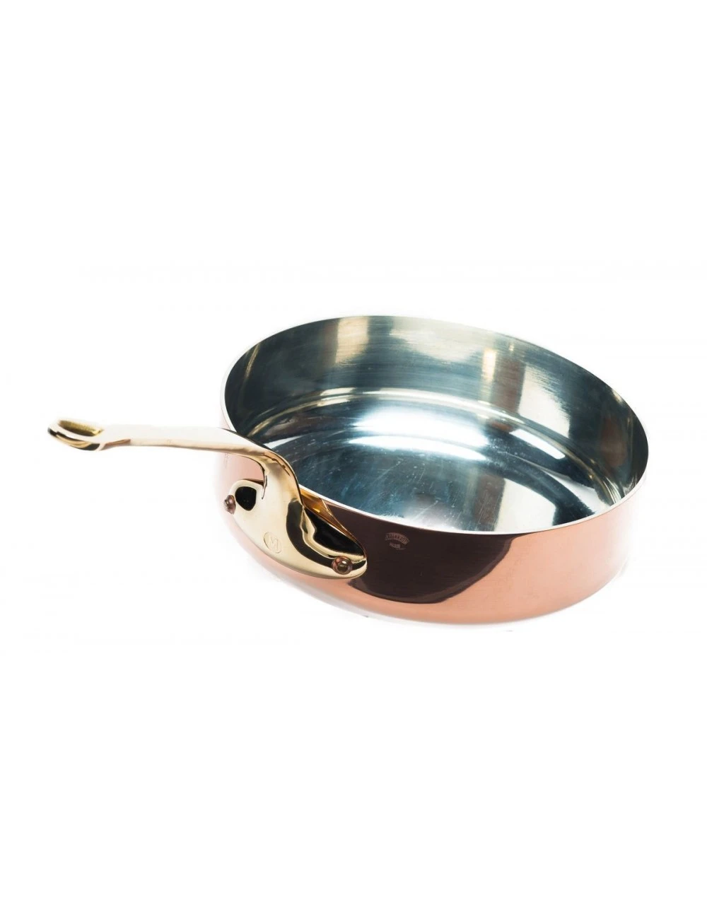 Plat à sauter à queue, cuivre forte épaisseur étamé, monture bronze. Le cuivre et l’étain forment un couple très homogène et permettent une parfaite conduction de la chaleur. Attention toutefois : l’étain peut se détériorer à sec dès 230 °C.