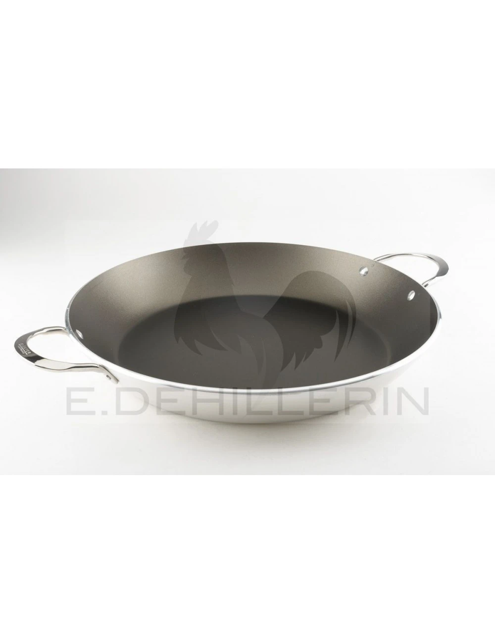Plat à paella en aluminium revêtement antiadhésif, monture fil d’inox. Le revêtement antiadhésif permet de limiter l’apport de matière grasse. Diamètre 40 cm.