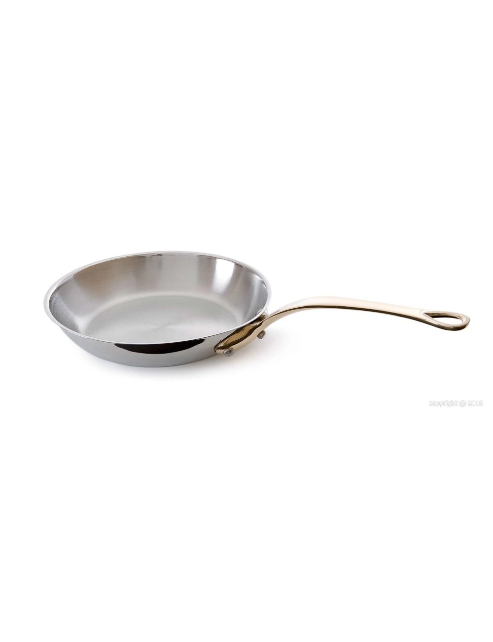 Poêle acier inoxydable, monture bronze. Une poêle techniquement évoluée avec une bonne conductivité. Sa monture bronze lui confère un certain cachet. Compatible tous feux dont induction.