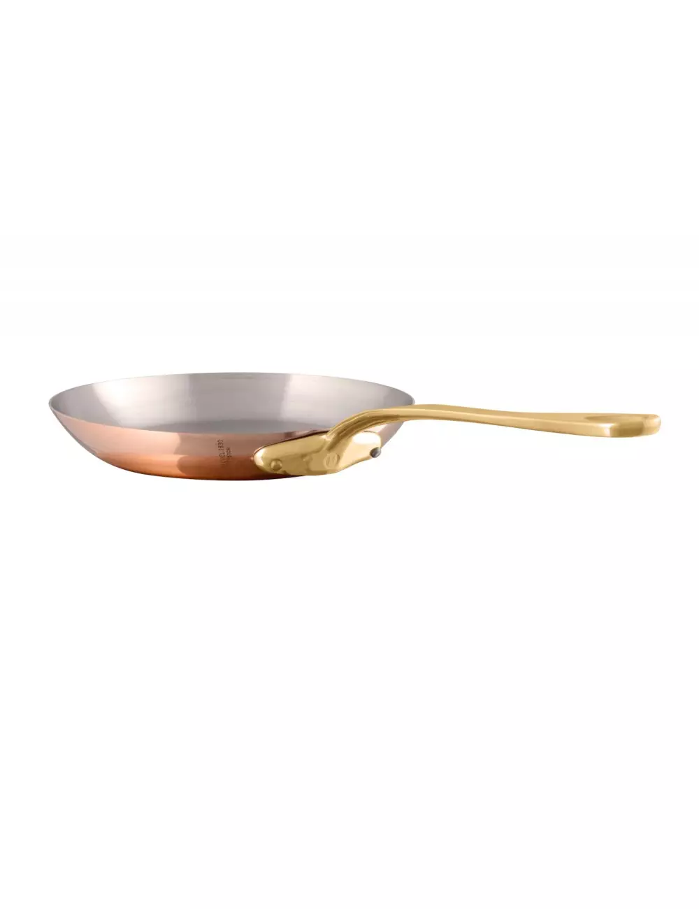 Poêle ronde en cuivre de 2mm d’épaisseur, intérieur acier inoxydable, monture bronze. Les avantages du cuivre sans les contraintes d’entretien et de nettoyage, grâce à la feuille d’inox.