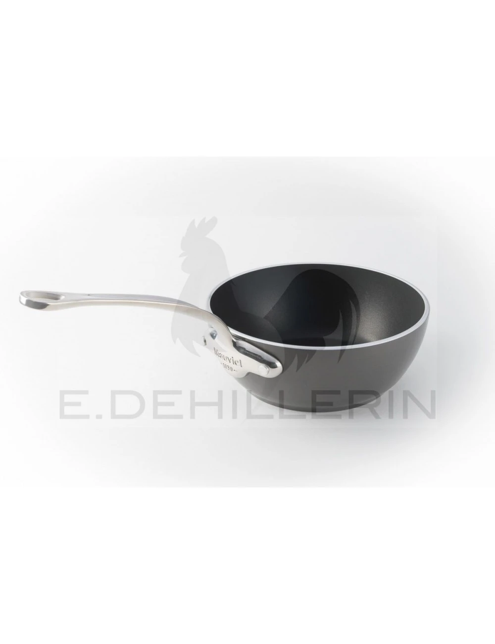 À quoi ça sert ? À mi-chemin entre la poêle et la casserole, la sauteuse est, comme son nom l’indique, l’ustensile idéal faire cuire rapidement les petites pièces de viande ou les légumes en morceaux dans un peu de matière grasse après les avoir dorés à feu vif. Ses bords évasés permettent d’accéder aisément aux angles avec le fouet lorsque l’on déglace pour préparer la sauce. Ils offrent aussi une plus grande surface d’évaporation qui facile la réduction de la sauce. Ne pas confondre la sauteuse et le sautoir ou plat à sauter. Sauteuse évasée bombée, aluminium anodisé, intérieur céramique, monture fonte d’inox (monture froide). Le revêtement antiadhésif permet de limiter l’apport de matière grasse, tandis que son look contemporain s’accorde aux cuisines modernes. Compatible tous feux dont induction. Diamètre 20 cm.